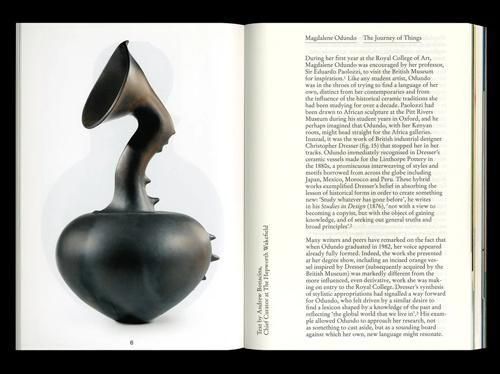 ケニヤ生まれのイギリス人陶芸家、マグダレン・オドゥンド(Magdalene Odundo)の作品集。本書は、2019年春にイギリスの西ヨークシャー州にある美術館ヘップワース・ウェイクフィールド(Hepworth Wakefield)で開催された展覧会「The Journey of Things」に伴い刊行された展覧会図録。44点に及ぶ作品に加え、博物館学的に重要な品々や現代作家の作品を幅広く収録し、作者の制作活動が世界中から得た様々なインスピレーションによって支えられていることを示している。本自体が作品となる「ブックオブジェ」である本書は、歴史的なものと現代のものとを対で並列的にレイアウトし、有機的な繋がりや流れで内容をより分かりやすく見せるためにセクションを交互に綴じ込んでいる。作者の制作物と共に、バーバラ・ヘップワース(Barbara Hepworth)、ヘンリー・ムーア(Henry Moore)、アンリ・ゴーディエ=ブルゼスカ(Henri Gaudier-Brzeska)、ルーシー・リー(Lucie Rie)、ジャン・アルプ(Jean Arp)といったアーティストの作品、古代ギリシャや古代エジプトの遺物、アフリカ、アジア、中央アメリカの歴史的な陶器、そしてアフリカ全土から集められた様々な儀式用品が収録されている。